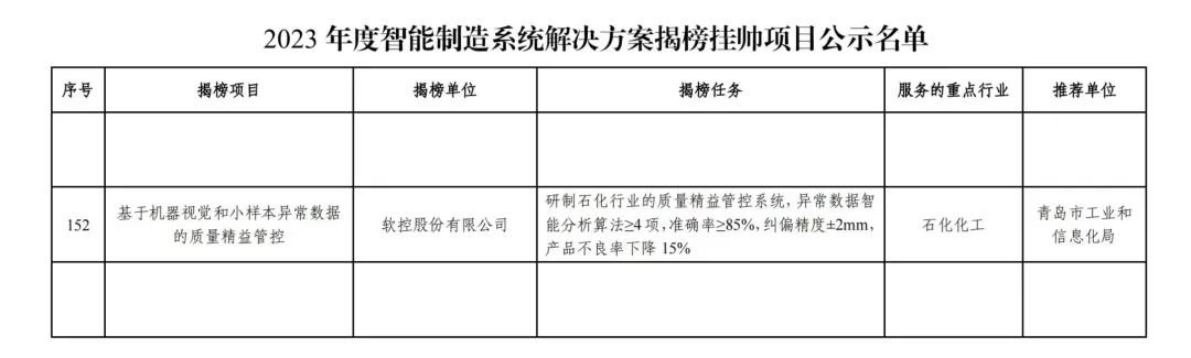 近日,軟控股份有限公司的“基于機(jī)器視覺(jué)和小樣本異常數(shù)據(jù)的質(zhì)量精益管控”成功入選國(guó)家工信部“2023年度智能制造系統(tǒng)解決方案揭榜掛帥項(xiàng)目”。