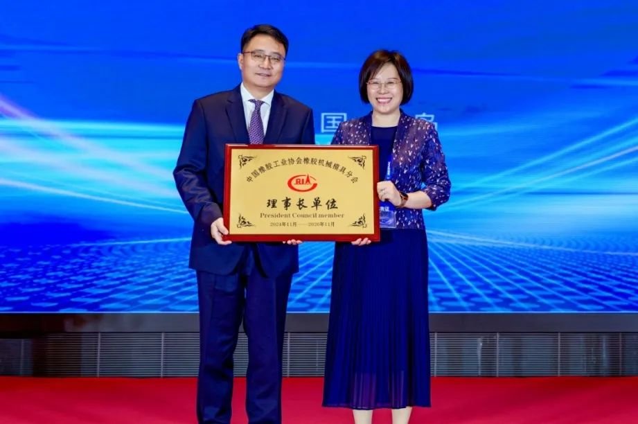 中國橡膠工業(yè)協(xié)會橡膠機械模具分會秘書長姜馨宣讀《關(guān)于橡膠機械模具分會理事長聘任人選的批復(fù)》。軟控股份有限公司成為中橡協(xié)橡膠機械模具分會第十一屆理事會理事長單位,軟控股份有限公司董事長兼總裁官炳政擔(dān)任中橡協(xié)橡膠機械模具分會第十一屆理事會理事長,中國橡膠工業(yè)協(xié)會會長徐文英為官炳政頒發(fā)理事長牌匾。