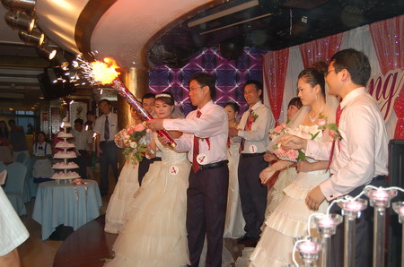 下午17時(shí)08分,婚宴典禮儀式在銀海大世界正式開(kāi)始。公司副總裁張澤恩為新人證婚,并代表公司向新人及其親屬表示真誠(chéng)的祝愿?;檠绗F(xiàn)場(chǎng)親情融融,熱鬧非凡。音樂(lè)聲中,副總裁王金健手持火炬,將幸福的火種依次傳遞給五對(duì)新人,最后,承載著幸福夢(mèng)想的心形燭火被點(diǎn)燃,一時(shí)間全場(chǎng)沸騰,熱鬧的氣氛達(dá)到高潮。宴會(huì)上,來(lái)賓們還欣賞到了精彩紛呈的文藝表演。
