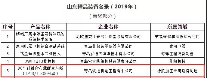 近日,山東省工業(yè)和信息化廳發(fā)布了《山東精品裝備名錄(2019年)》,軟控90°纖維簾布裁斷生產(chǎn)線(TP-3/T-300機(jī)型)成功入選“山東精品裝備”行列。