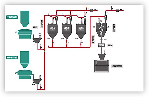 原料輸送:可實(shí)現(xiàn)大批量、遠(yuǎn)距離、高效率輸送;快速準(zhǔn)確的取料并輸送到指定位置;管道封閉輸送有效避免污染。
