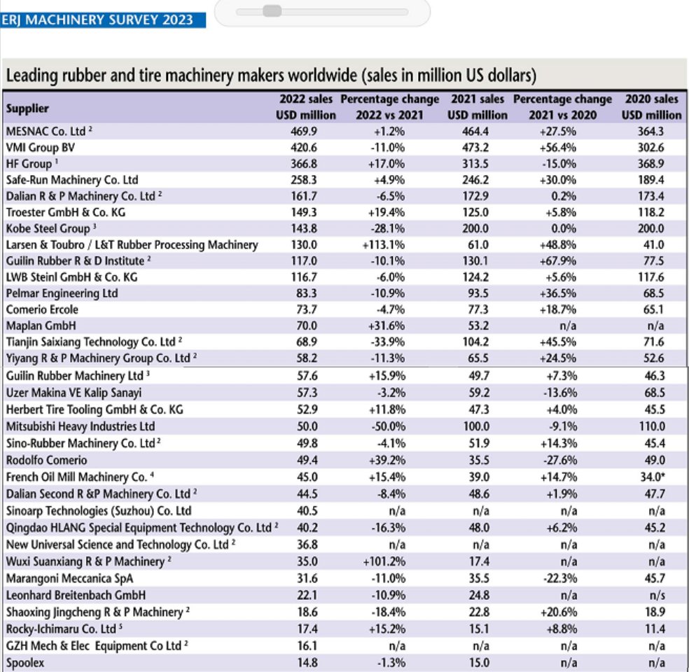 在最新出版的歐洲橡膠雜志(European Rubber Journal) 5/6月刊,公布了2022年全球橡膠機(jī)械行業(yè)企業(yè)的銷售收入排名,軟控(MESNAC)位居第一。